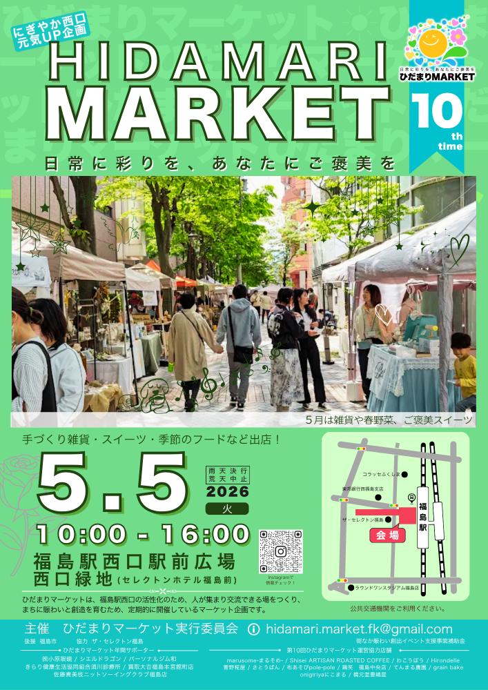 ひだまりマーケットは、福島駅西口を舞台に、子どもからお年寄りまで楽しめるフリーマーケットです。